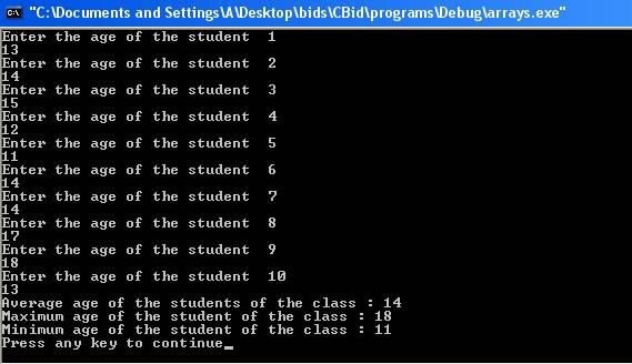 age is the identifier of the array which is of type integer and whose size is 10. In the for loop user is asked to enter the age of the student, the age is stored in the element of the array by the statement