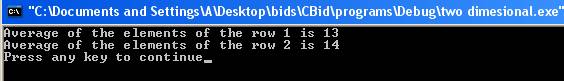 When an element of the array of n dimensional is referenced it uses n index values. For example first element of a two dimensional array declared above is referred as age[0][0] as the index starts from zero and last element is referred as age[1][4]. Here is a program which calculates the average of the elements of the row of the two dimensional array.