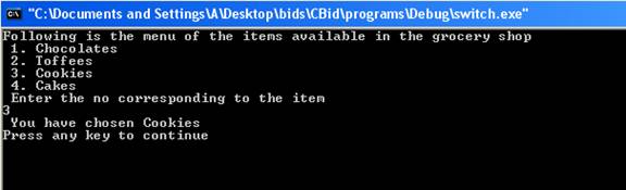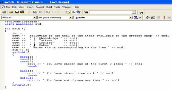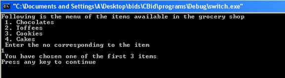 The switch statement allows doing multiple selections depending upon the value of expression. It tests the value of the expression against the integer or character constants. The value of the expression must be integer or character. The value of the expression is tested against the constants in the case statements. When a correct match is found sequence of statements associated with the constant is executed until the break statement or the end of the switch statement is reached. If no match is found then sequence of statements associated with default is executed. The case values appear in case labels. No two or more case labels can contain same constant values. The case values can occur in any sequence. Here is a program which illustrates the working of switch statement.