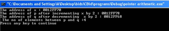 variables x and p are pointers of double type. Pointer x is incremented by 1. Now if the memory address of x was 2000 and after incrementing p will contain memory address 2008 as double takes 8 bytes. Decrementing the pointer results in decrementing the memory address by the number of bytes occupied by the base type. You cannot add two pointers. No multiplication and division can be performed on pointers. Here is a program which illustrates the working of pointer arithmetic.