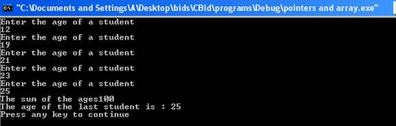sum of the ages is calculated. The pointer is again referred to the address of the first element of the array. The age of the last student cab be accessed using *(p+4) which contains the value of the 5th element of the array.