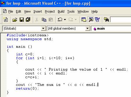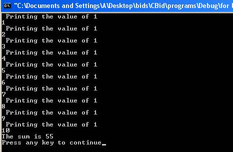 computes the sum of the values of the variable i. At the last iteration the value of the variable i becomes 11 when statement i++; is executed and then the condition i<=10; is checked and now the condition is false and as a result the loop is terminated. The control of the program is transferred to the statement following the for loop. The statement