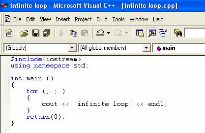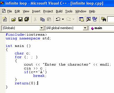 is executed infinite times as there is no condition expression in the for statement. The infinite loop can be broken using an if and break statement. Here is the program which shows how to discontinue the infinite loop.