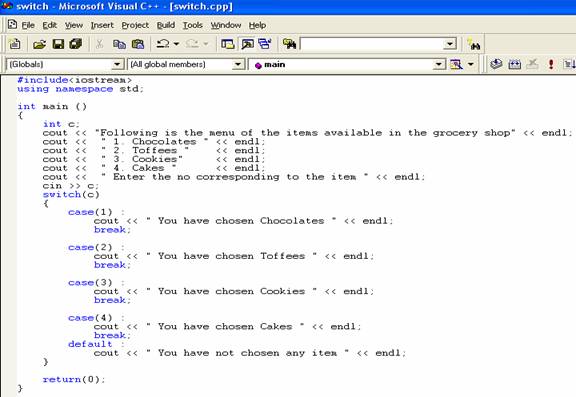 The switch statement allows doing multiple selections depending upon the value of expression. It tests the value of the expression against the integer or character constants. The value of the expression must be integer or character. The value of the expression is tested against the constants in the case statements. When a correct match is found sequence of statements associated with the constant is executed until the break statement or the end of the switch statement is reached. If no match is found then sequence of statements associated with default is executed. The case values appear in case labels. No two or more case labels can contain same constant values. The case values can occur in any sequence. Here is a program which illustrates the working of switch statement.