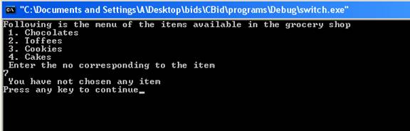If the user has entered value other than the constants in the case labels then the statement associated with the default would have been executed. Here is the result of the same program which shows the execution of default statement.